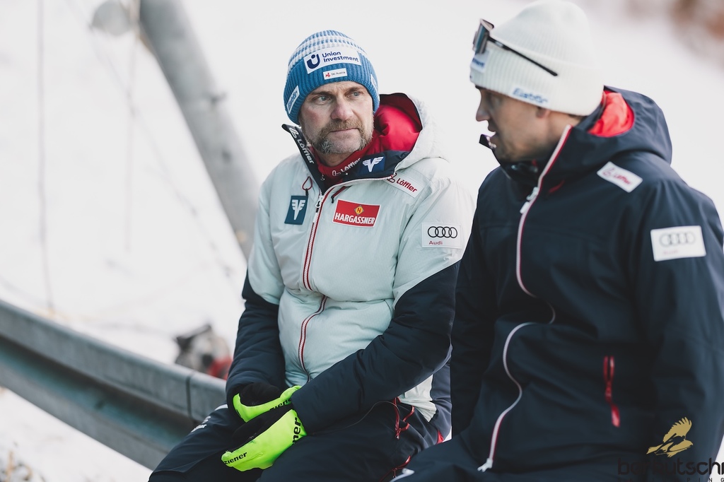 31.12.2025, Olympiaschanze, Garmisch Partenkirchen, GER, FIS Weltcup Ski Sprung, Vierschanzentournee, Garmisch Partenkirchen, Herren, Qualifikation, im Bild Cheftrainer Andreas Widhoelzl (AUT), Sportlicher Leiter Ski Nordisch Florian Liegl (AUT) // Cheftrainer Andreas Widhoelzl (AUT), Sportlicher Leiter Ski Nordisch Florian Liegl (AUT) during the men qualifying for the Four Hills Tournament of the Viessmann FIS Ski Jumping World Cup at the Olympiaschanze, Garmisch Partenkirchen, Germany on 2025/12/31. EXPA Pictures © 2025, PhotoCredit: EXPA/ JFK