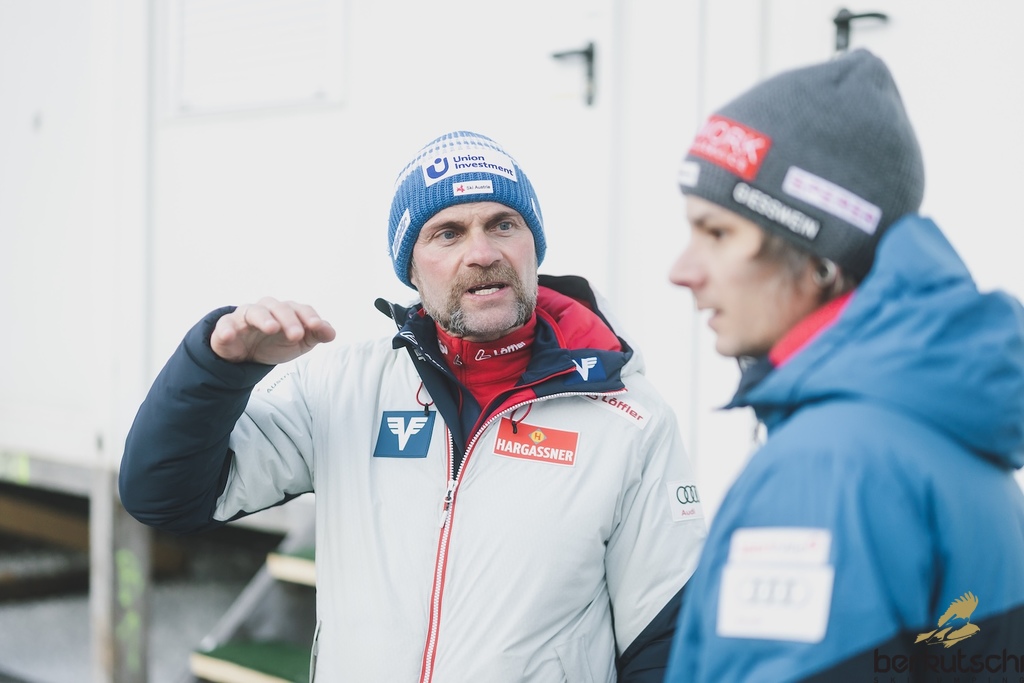 31.12.2025, Olympiaschanze, Garmisch Partenkirchen, GER, FIS Weltcup Ski Sprung, Vierschanzentournee, Garmisch Partenkirchen, Herren, Qualifikation, im Bild Cheftrainer Andreas Widhoelzl (AUT), Manuel Fettner (AUT) // Cheftrainer Andreas Widhoelzl (AUT), Manuel Fettner (AUT) during the men qualifying for the Four Hills Tournament of the Viessmann FIS Ski Jumping World Cup at the Olympiaschanze, Garmisch Partenkirchen, Germany on 2025/12/31. EXPA Pictures © 2025, PhotoCredit: EXPA/ JFK