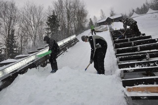 Na nájezdu leželo místy až sto centimetrů napadaného a nafoukaného sněhu. Po vyfrézované nájezdové stopě ani stopy. Mladíci si na boty připevnili mačky a v devět hodin ráno začali s ručním odhazováním sněhových závějí, v kterých se bořili po pás. Až po „hrubém“ očištění můstku mohli pracovníci skokanského areálu využít frézu a vytvořit novou nájezdovou stopu.