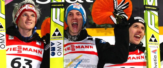 Až poslední skok, tři desetinky bodu… a zlato nezískává jasný dominátor sezony Thomas Morgenstern. První zůstává jeho rakouský krajan Gregor Schlierenzauer. Okolo nich těžce spadly medailové naděje norského dua Andersů Jacobsena s Bardalem. Bronz bere švýcarský profesor Simon Ammann.