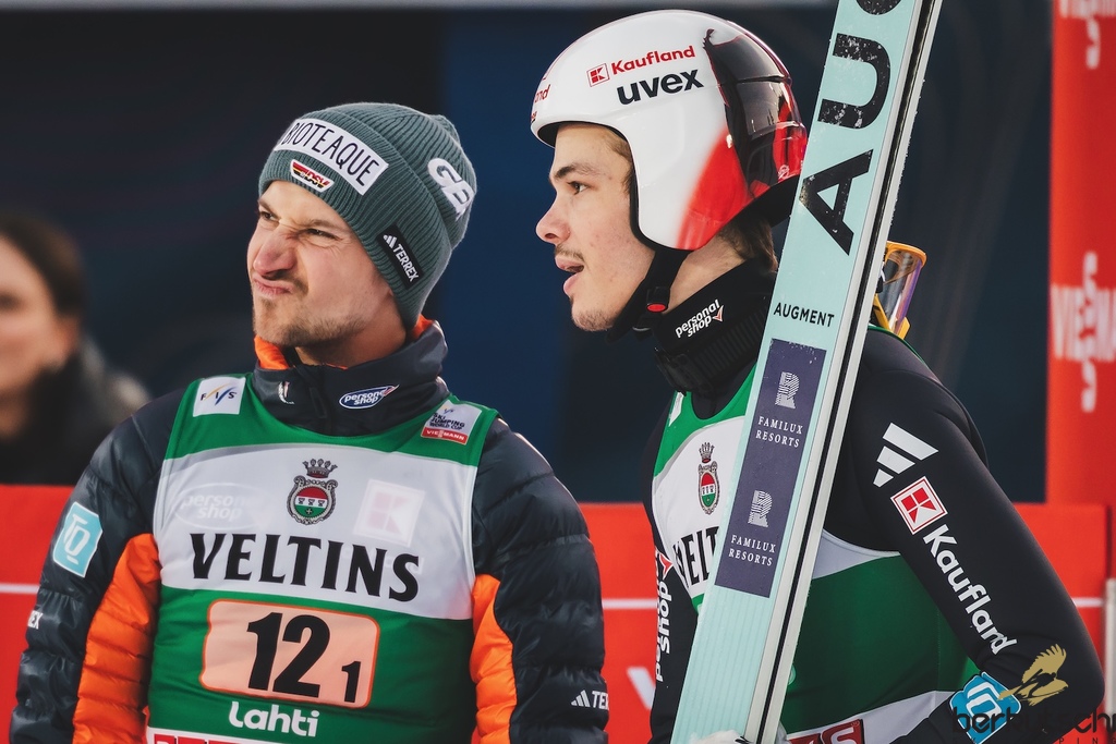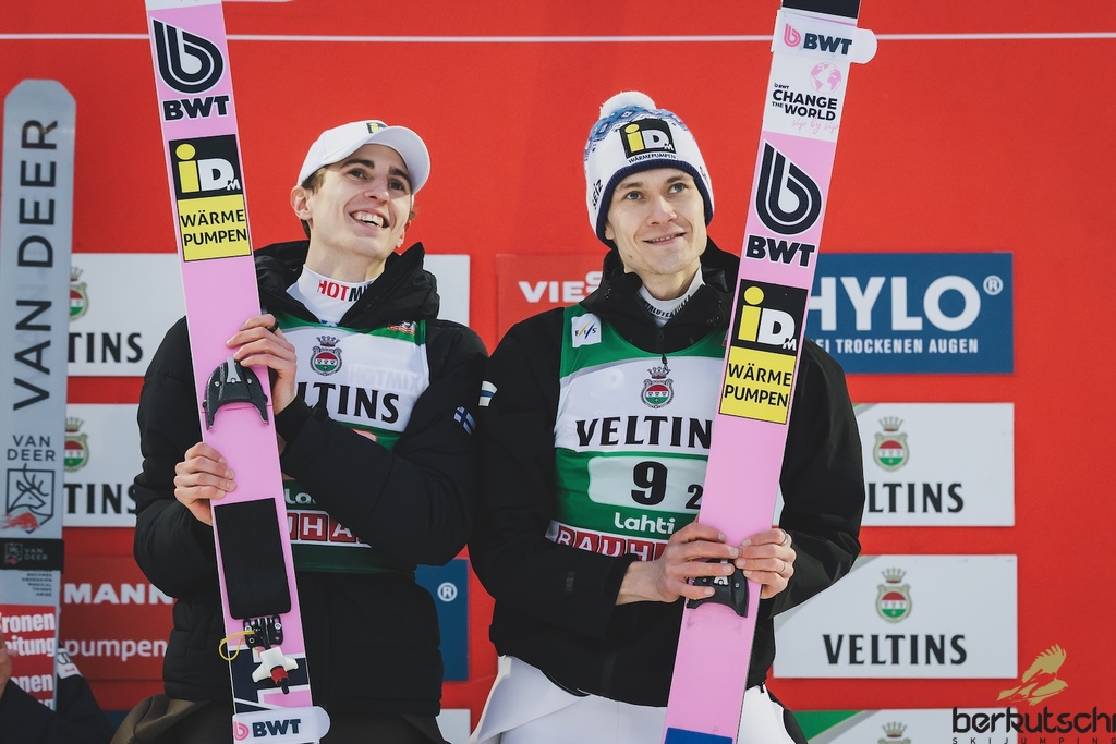 08.03.2026, Lahti, FIN, FIS Weltcup Ski Sprung, Lahti, Herren, Super Team, Grossschanze, im Bild Jan Hoerl (AUT), Daniel Tschofenig (AUT) // Jan Hoerl (AUT), Daniel Tschofenig (AUT) during men super team large hill competition of the Viessmann FIS Ski Jumping World Cup. Lahti, Finland on 2026/03/08. EXPA Pictures © 2026, PhotoCredit: EXPA/ Tadeusz Mieczynski