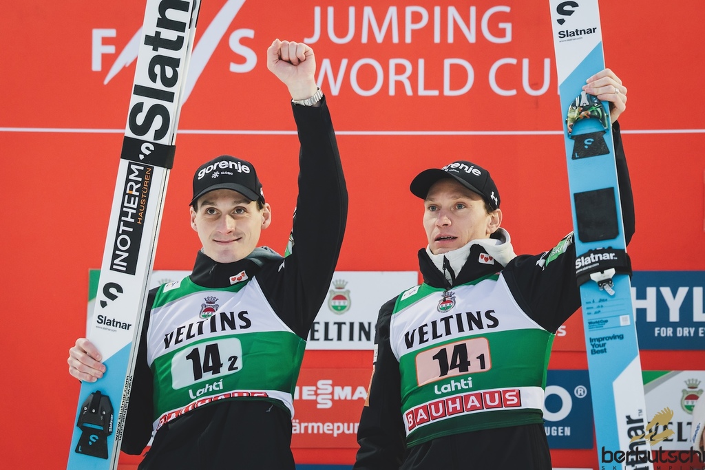 08.03.2026, Lahti, FIN, FIS Weltcup Ski Sprung, Lahti, Herren, Super Team, Grossschanze, im Bild Domen Prevc (SLO), Anze Lanisek (SLO) // Domen Prevc (SLO), Anze Lanisek (SLO) during men super team large hill competition of the Viessmann FIS Ski Jumping World Cup. Lahti, Finland on 2026/03/08. EXPA Pictures © 2026, PhotoCredit: EXPA/ Tadeusz Mieczynski