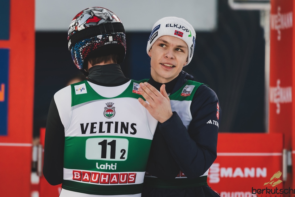 08.03.2026, Lahti, FIN, FIS Weltcup Ski Sprung, Lahti, Herren, Super Team, Grossschanze, im Bild Andreas Isak Langmo (NOR), Marius Lindvik (NOR) // Andreas Isak Langmo (NOR), Marius Lindvik (NOR) during men super team large hill competition of the Viessmann FIS Ski Jumping World Cup. Lahti, Finland on 2026/03/08. EXPA Pictures © 2026, PhotoCredit: EXPA/ Tadeusz Mieczynski