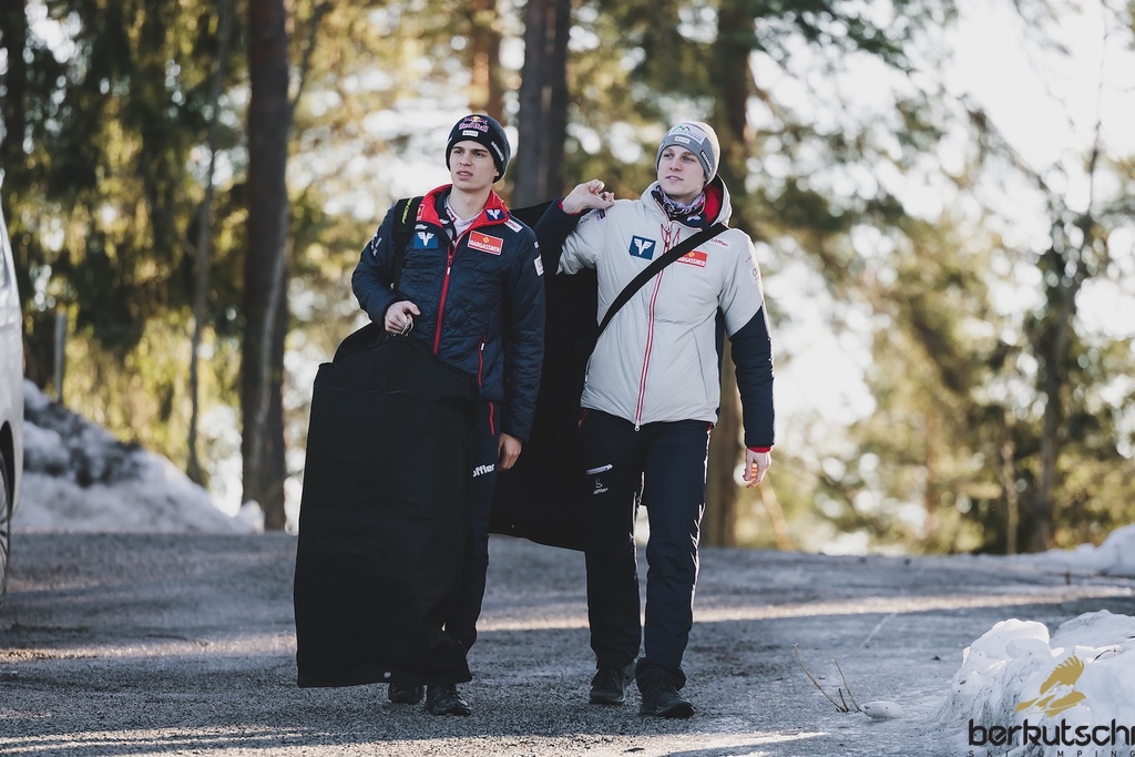 07.03.2026, Lahti, FIN, FIS Weltcup Ski Sprung, Lahti, Herren, Einzelbewerb, Grossschanze, im Bild Stephan Embacher (AUT), Jonas Schuster (AUT) // Stephan Embacher (AUT), Jonas Schuster (AUT) during men large hill individual competition of the Viessmann FIS Ski Jumping World Cup. Lahti, Finland on 2026/03/07. EXPA Pictures © 2026, PhotoCredit: EXPA/ Tadeusz Mieczynski