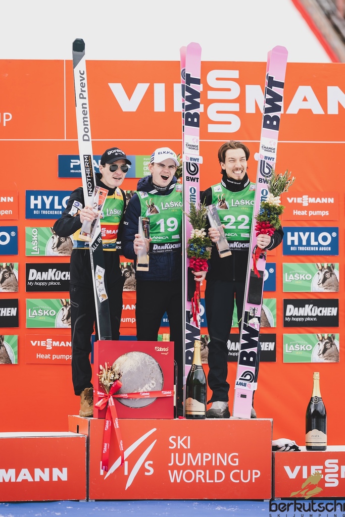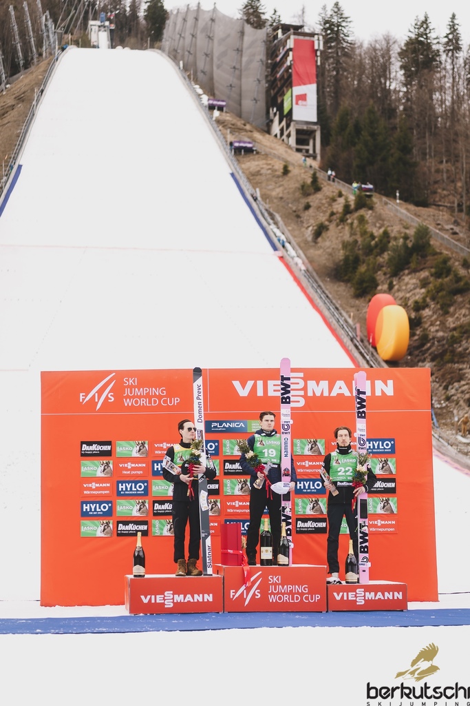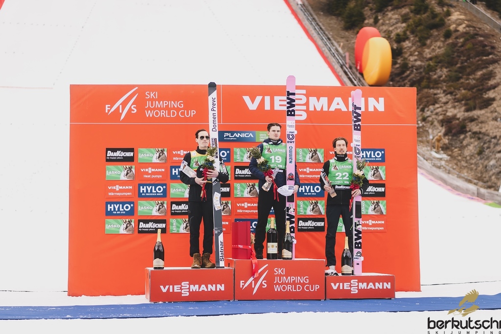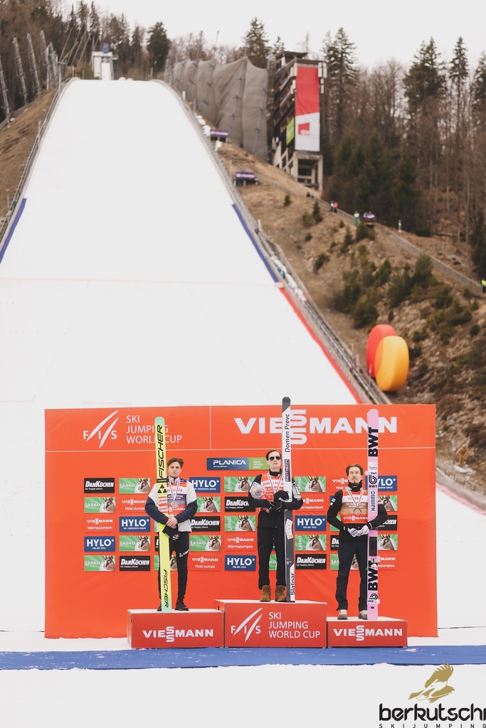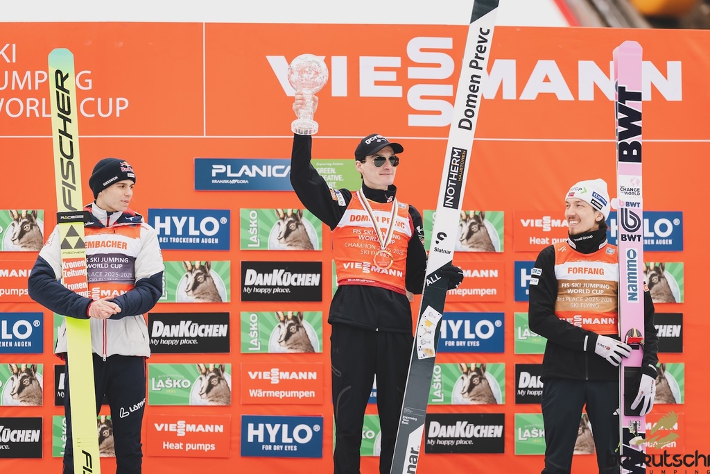 29.03.2026, Planica, Ratece, SLO, FIS Weltcup Ski Sprung, Finale, Planica, Herren, Skiflug, Einzelbewerb, im Bild 2. Platz Domen Prevc (SLO), 1. Platz Marius Lindvik (NOR), 3. Platz Johann Andre Forfang (NOR) // 2nd place Domen Prevc of Slovenia, Winner Marius Lindvik of Norway, 3rd place Johann Andre Forfang of Norway during the men's individual ski flying competition at the FIS Ski Jumping World Cup Finals in Planica. Ratece, Slovenia on 2026/03/29. EXPA Pictures © 2026, PhotoCredit: EXPA/ JFK
