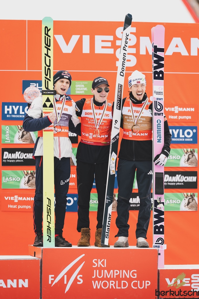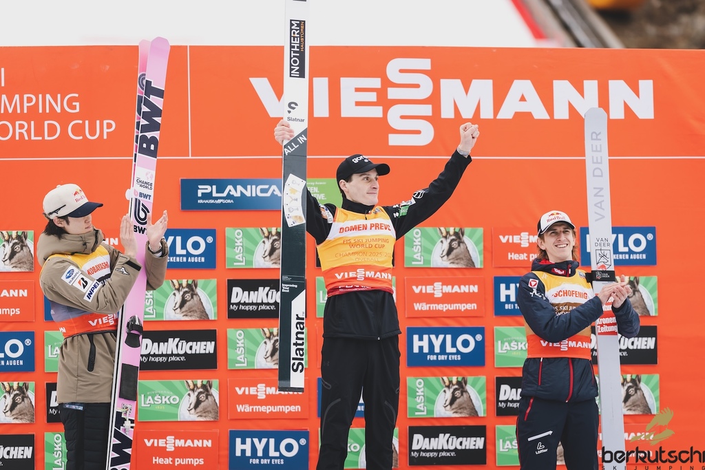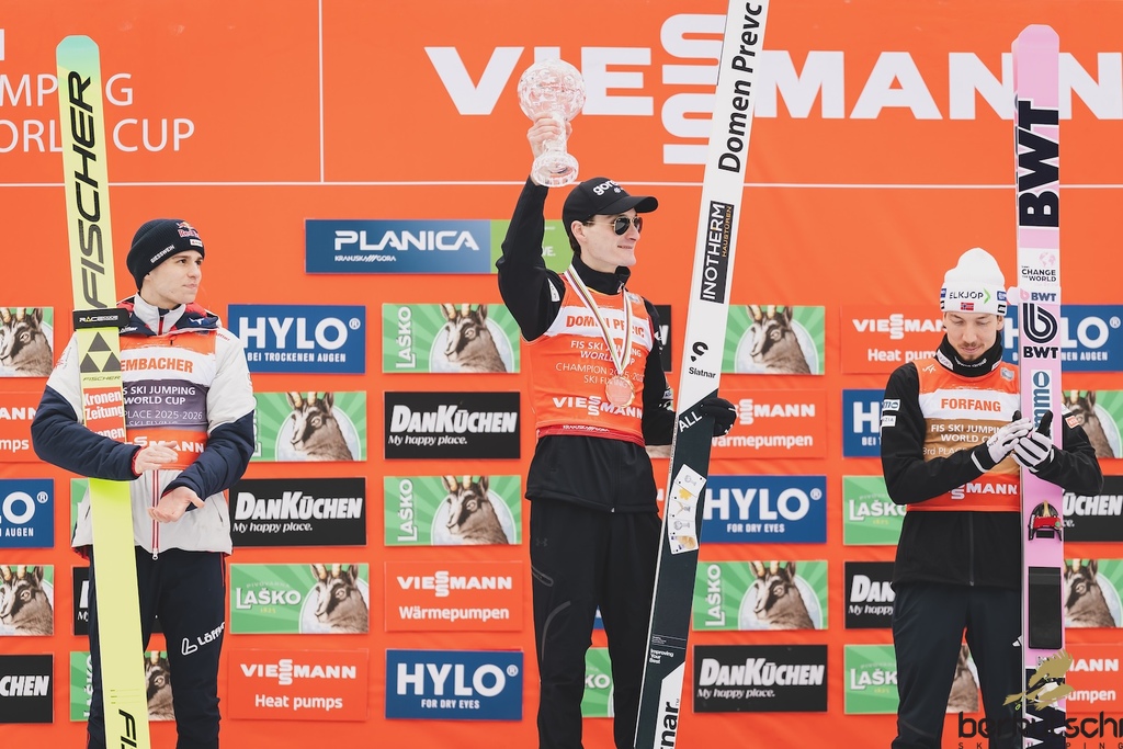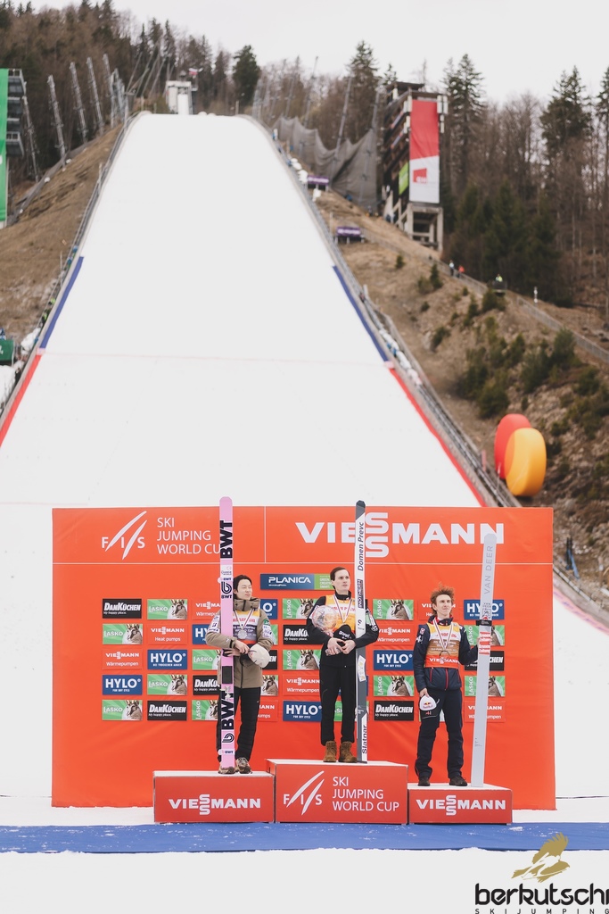 29.03.2026, Planica, Ratece, SLO, FIS Weltcup Ski Sprung, Finale, Planica, Herren, Skiflug, Einzelbewerb, im Bild Ski Springen Weltcup 2. Platz Ryoyu Kobayashi (JPN), Gesamtweltcupsieger Domen Prevc (SLO), 3. Platz Daniel Tschofenig (AUT) // Ski Jumping World Cup 2nd place Ryoyu Kobayashi of Japan, Ski Jumping World Cup Champion Domen Prevc of Slovenia, 3rd place Daniel Tschofenig of Austria during the men's individual ski flying competition at the FIS Ski Jumping World Cup Finals in Planica. Ratece, Slovenia on 2026/03/29. EXPA Pictures © 2026, PhotoCredit: EXPA/ JFK