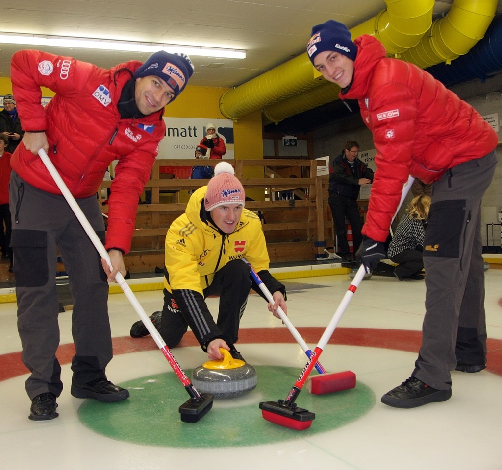 Австрийские и немецкие прыгуны выбрали особый вид подготовки к предстоящему этапу Кубка мира в Энгельберге. В четверг они соревновались друг с другом в керлинг.