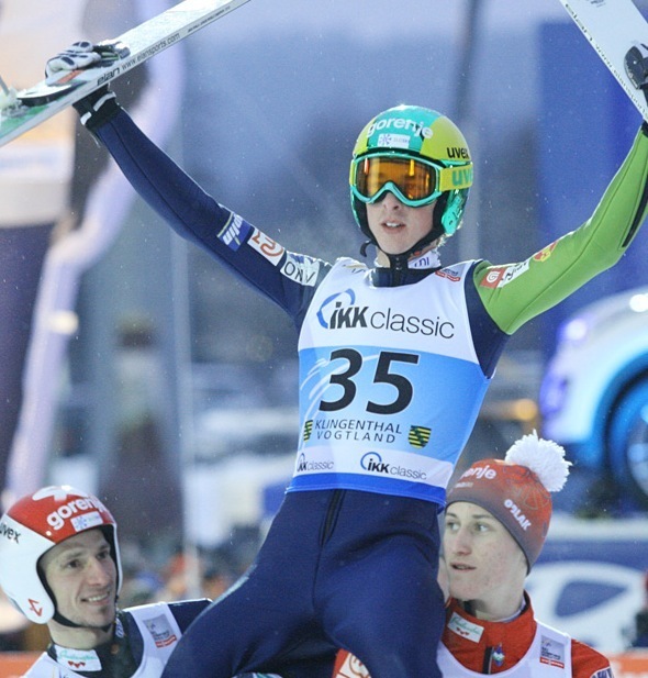 Словенец Яка Хвала одержал первую победу в Кубке мира сегодня в Клингентале. Хвала, недавно победивший в чемпионате мира среди юниоров, захватил лидерство уже после первого раунда с прыжком на 142.5 м. И в этот раз он сумел защитить позицию и завоевать первую победу в финале прыжком на 133 м. 19-летний спортсмен заработал в итоге 259.5 балла.